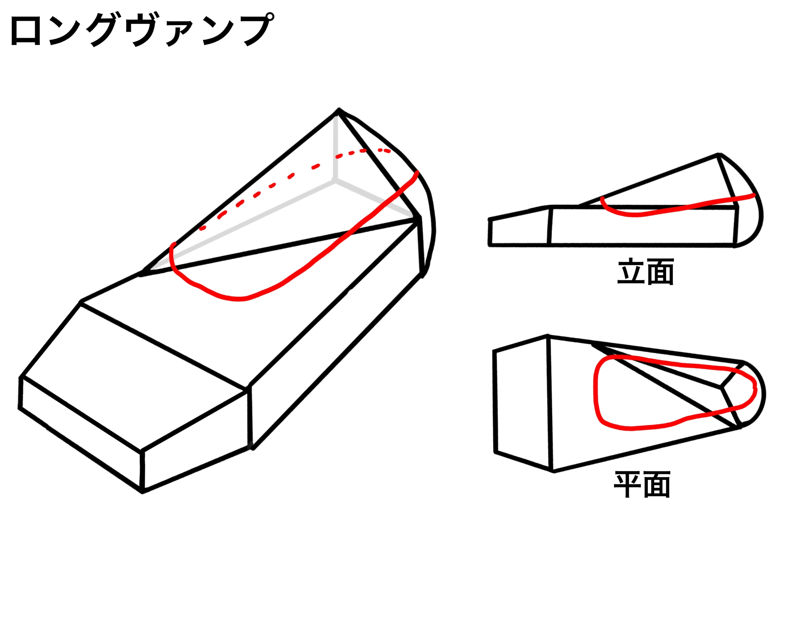 多くのデザインで見られるのがヴァンプラインでの立体化です。
