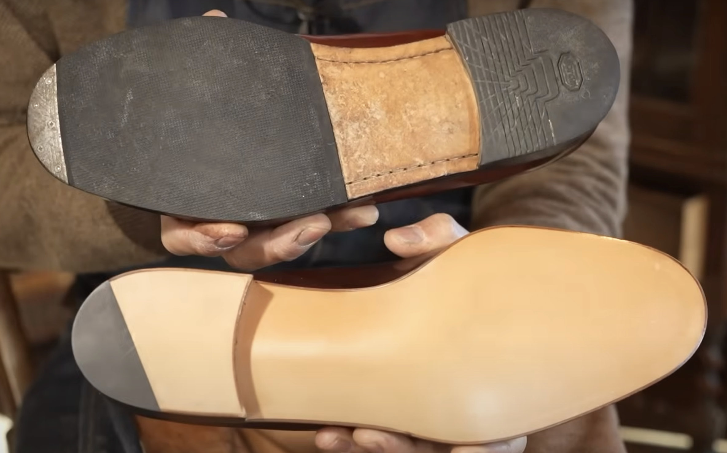 靴の製作過程においてソール内部には強力な接着剤を満遍なく塗布します。これは水分を通しませんし、インソール(中底)は3~6mm の厚み、レザーソール(本底)は4~6mmの厚みがあるわけで、それぞれに水分を貫通させようとするには水に何時間も浸す必要があります。